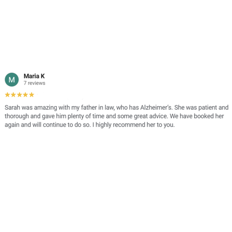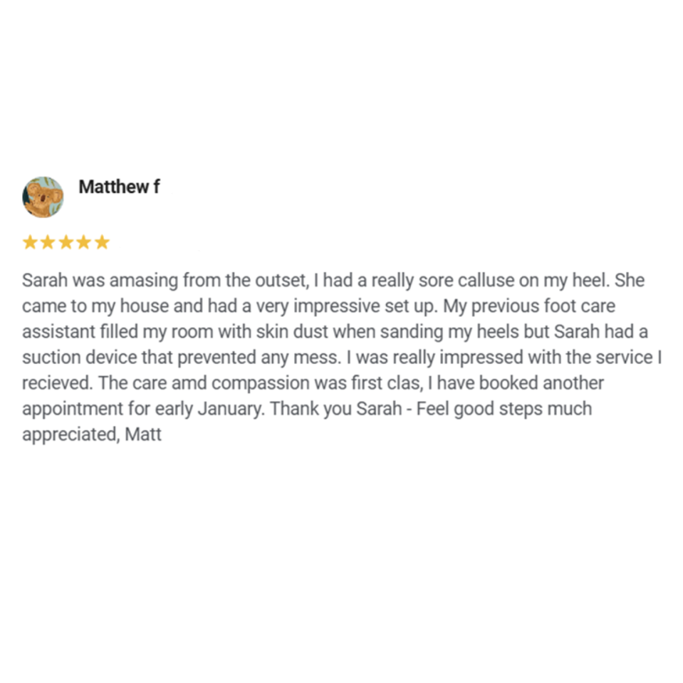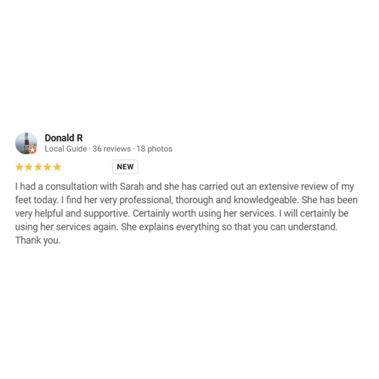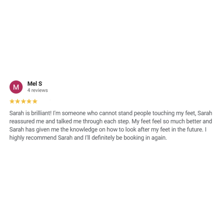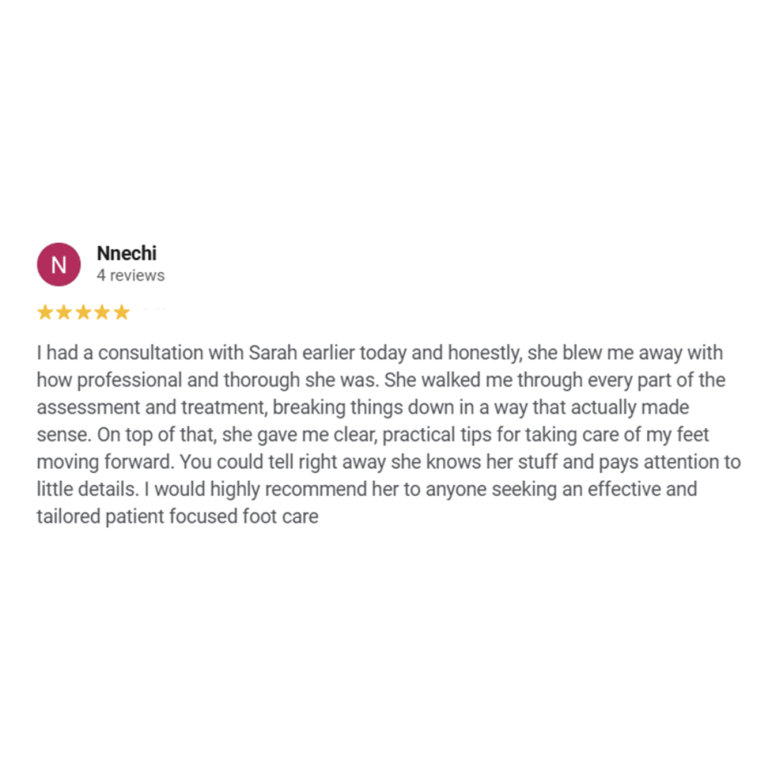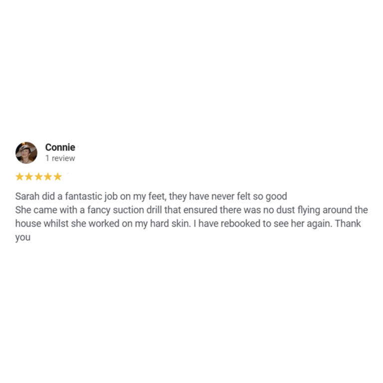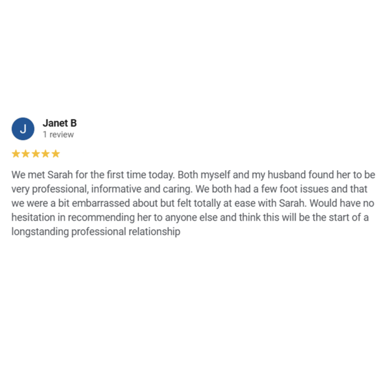I recommend Sarah as when she visited our house for the first time to cut my toenails, Sarah was very efficient, professional and knowledgeable and she explained how to look after my feet.